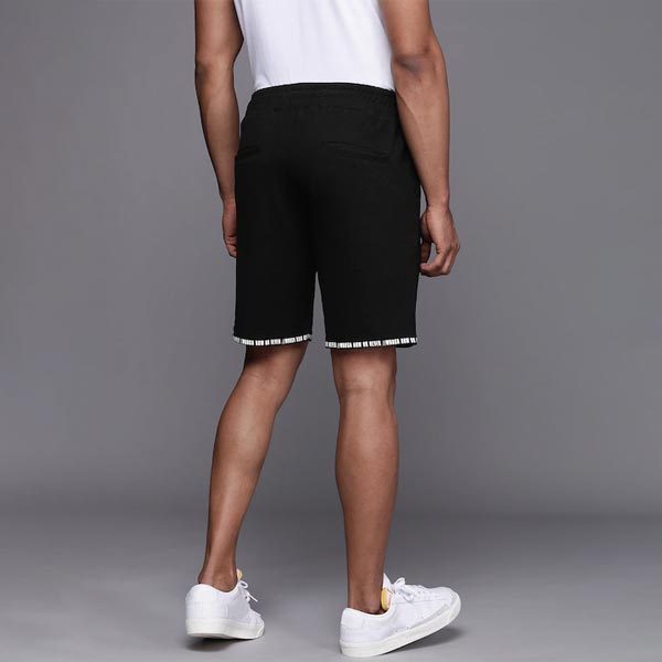 Black typography printed mid-rise regular shorts, has 4 pockets, drawstring closure