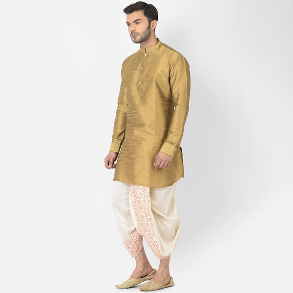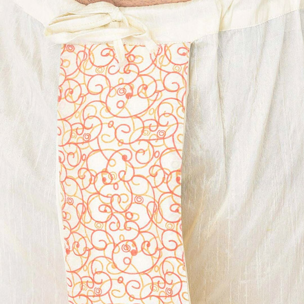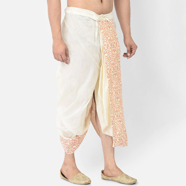 - Off white and orange printed dhoti with pleats, has a waistband with drawstring fastening