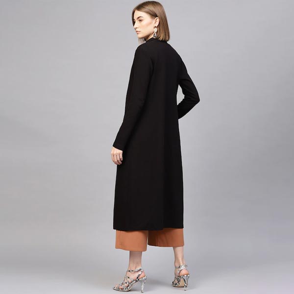 Black ribbed open front longline shrug, has long sleeves, straight hem